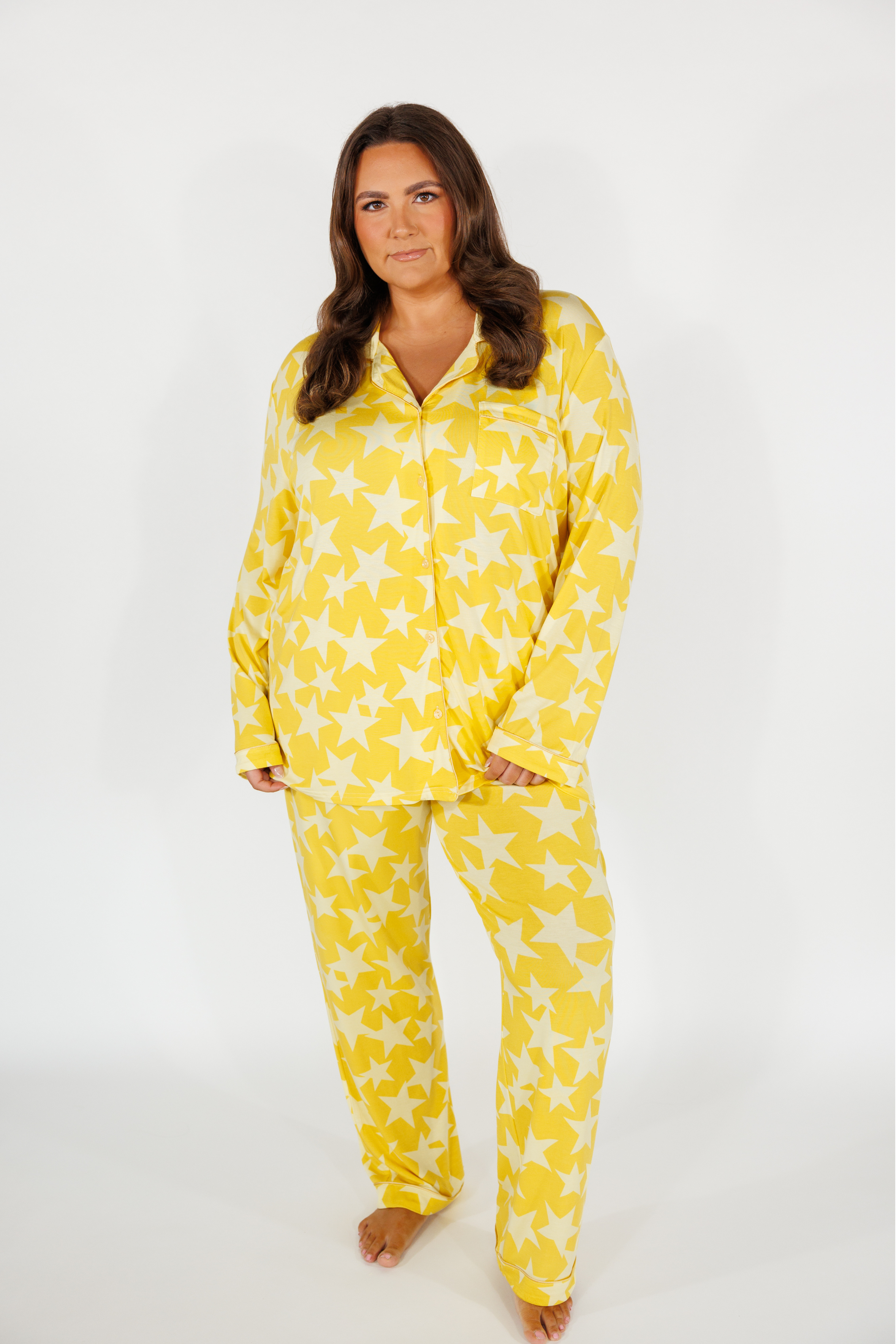 Get ready to slink into the Bright Stars in Gold Long Sleeve & Pant Pajama Set, the most luxurious sleepwear you'll ever wear. Made with the finest modal fibers, these pajamas are so soft and buttery, you'll never want to take them off. The classic women's PJ silhouette is flattering and comfortable, while the Bright Stars print adds a touch of southern sophistication.