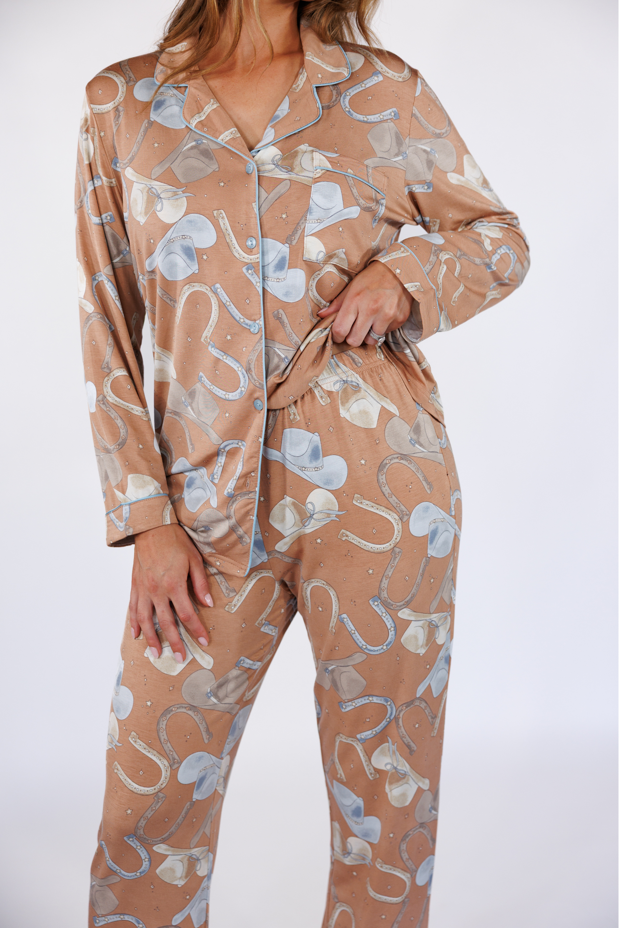 Get ready to slink into the Hats & Horseshoes in Clay Long Sleeve & Cropped Pant Pajama Set, the most luxurious sleepwear you'll ever wear. Made with the finest modal fibers, these pajamas are so soft and buttery, you'll never want to take them off. The classic women's PJ silhouette is flattering and comfortable, while the Hats & Horseshoes print adds a touch of southern sophistication.