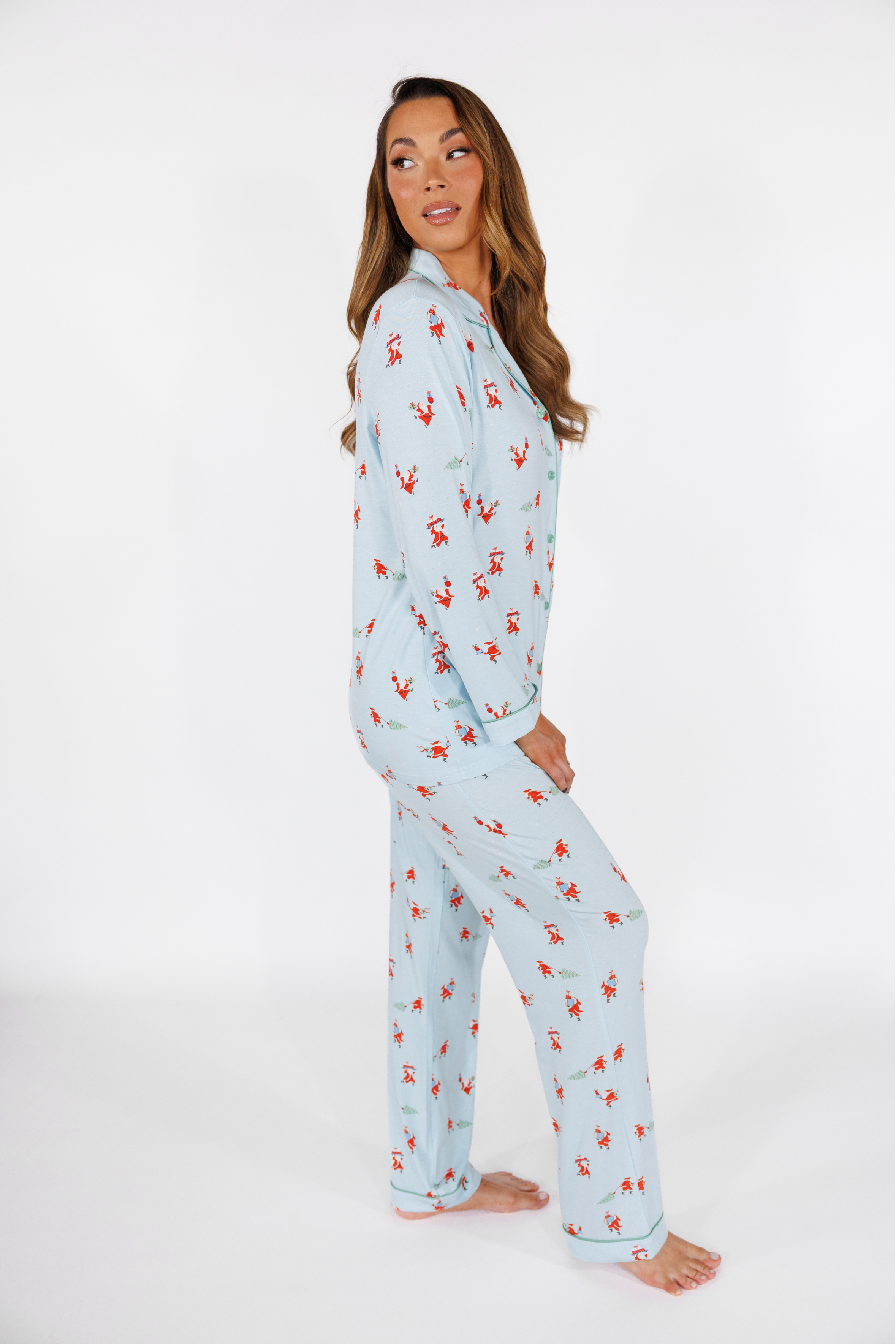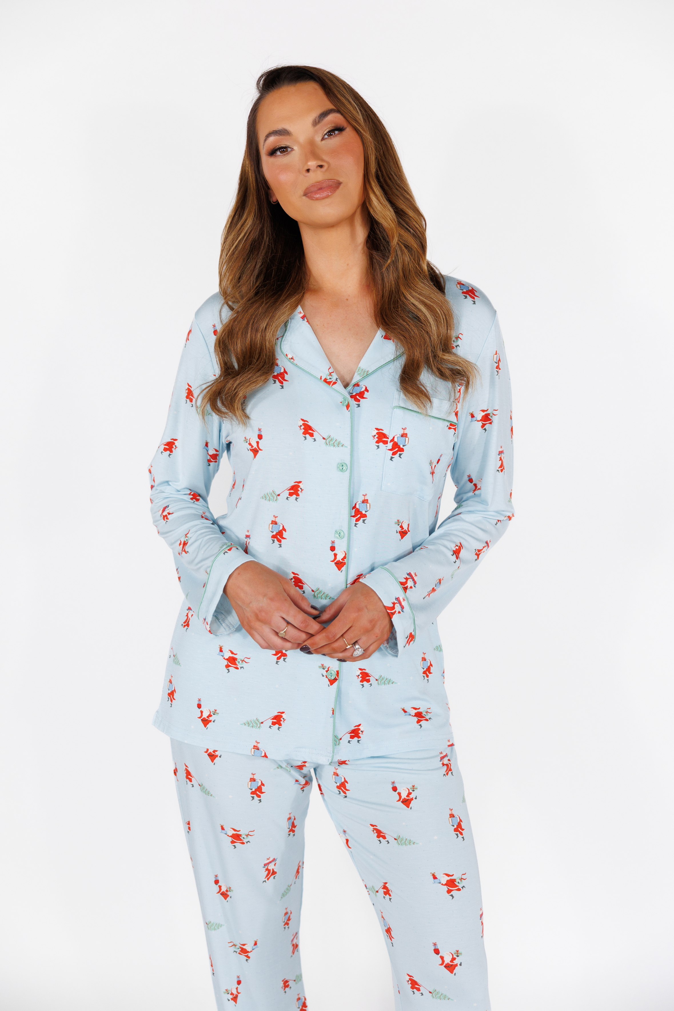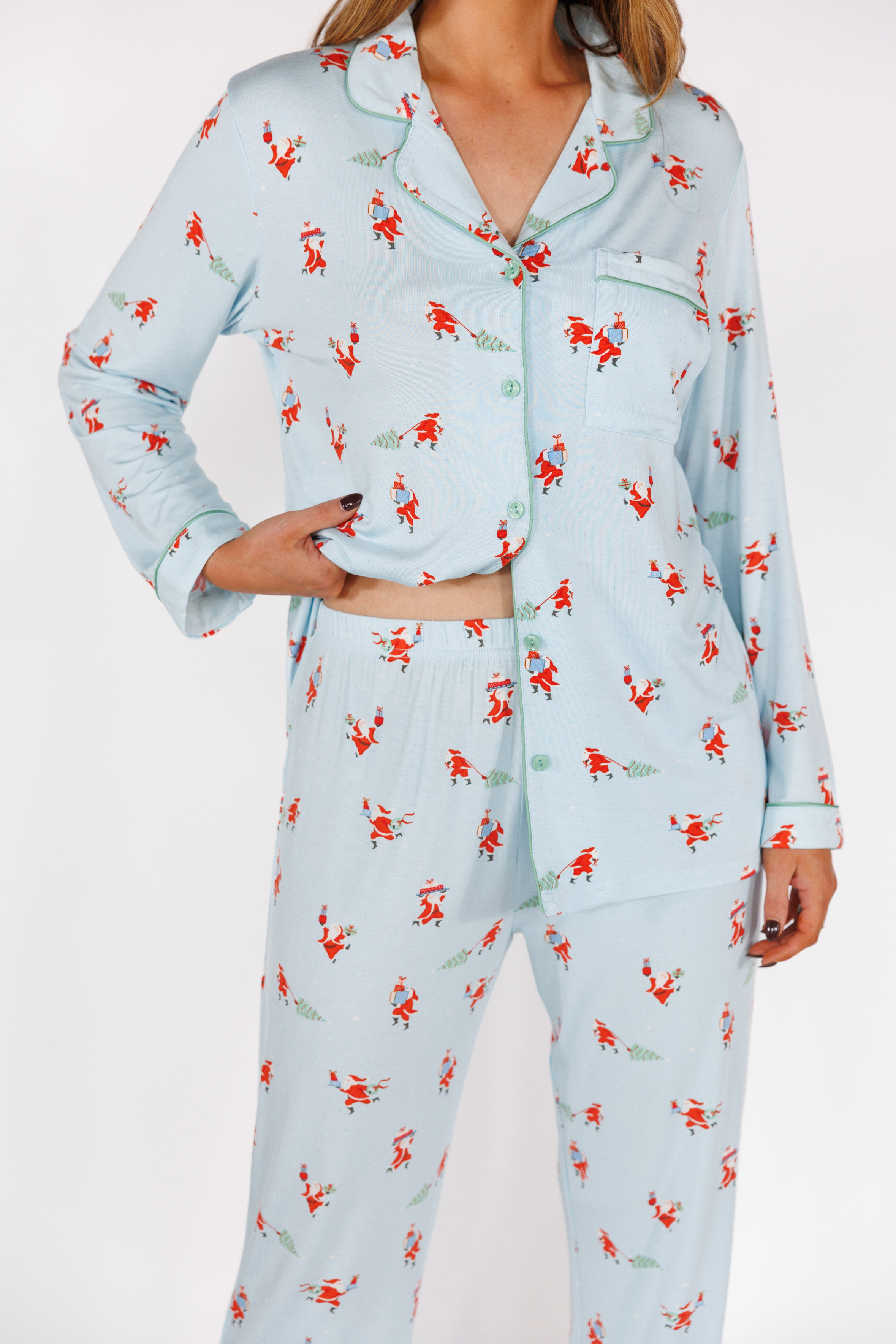 Get ready to slink into the Santa Express Long Sleeve & Pant Pajama Set, the most luxurious sleepwear you'll ever wear. Made with the finest modal fibers, these pajamas are so soft and buttery, you'll never want to take them off. The classic women's PJ silhouette is flattering and comfortable, while the Santa Express print adds a touch of southern sophistication.
